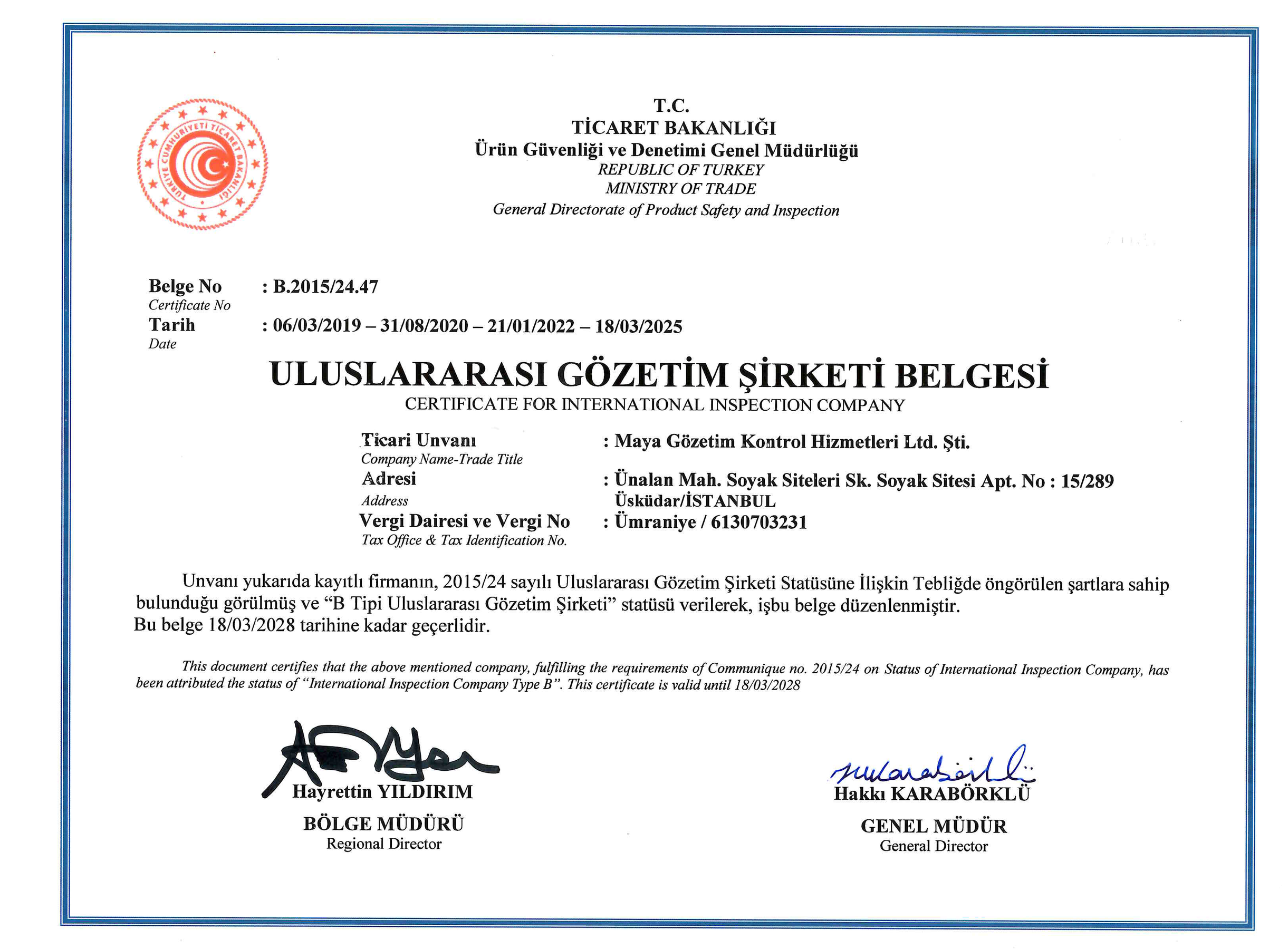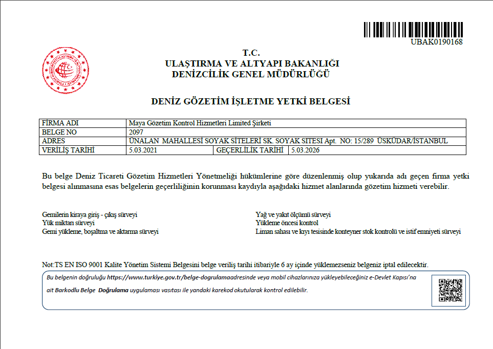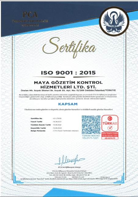 Hizmet kalitemizi belgeyelen sertfikalarımızı inceleyebilirsiniz. ISO 9001:2015 “Uluslararası Emtia Gözetim ve Ekspertiz Hizmetleri ve Tehlikeli Madde Gözetim Hizmetleri, Uluslararası Gözetim Şirketleri Belgesi ve Deniz Gözetim İşletme Yetki Belgesi.